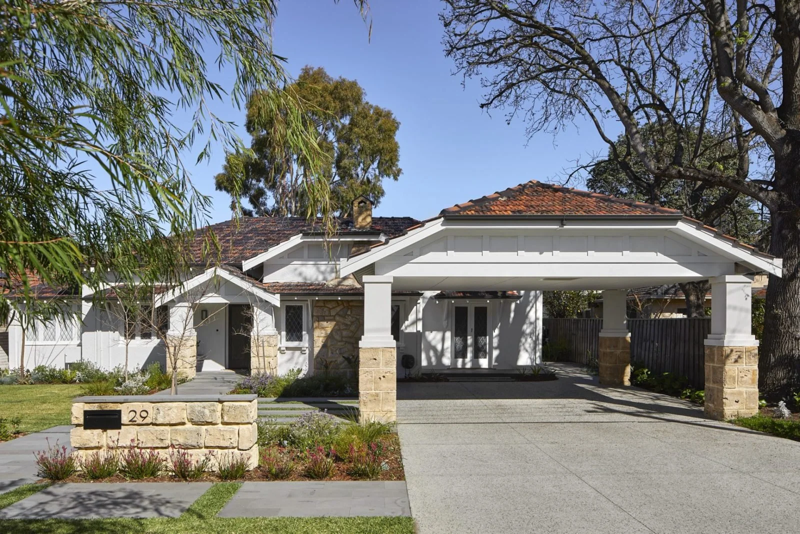 Careful window and door placement invites natural light deep into the interiors, framing views to the pool and landscaped gardens to strengthen indoor–outdoor connection. The redesigned entry and carport create an inviting street presence, with limestone details and sympathetic rooflines that honour the original character.